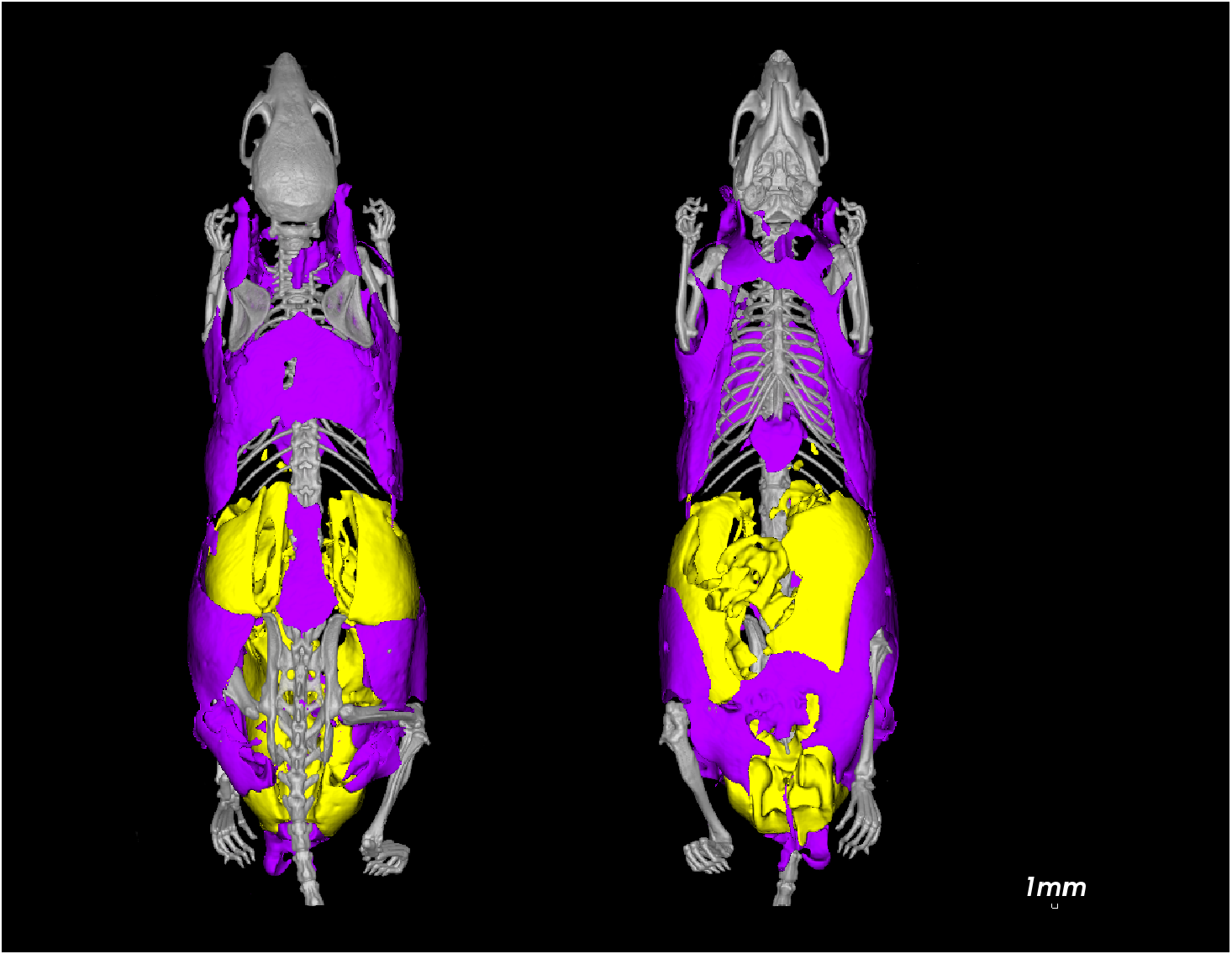 图三:小鼠全身脂肪3D渲染图(皮下脂肪:紫色;内脏脂肪:黄色)