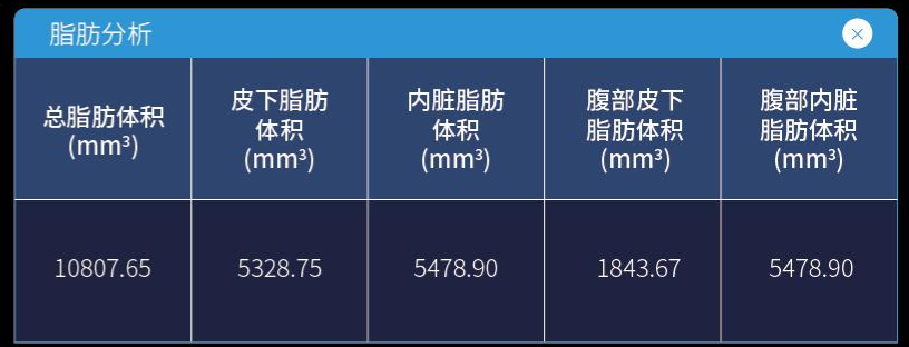 锐视科技自主研发的Micro-CT成像系统IMAGING 100软件的脂肪分析模块采用AI算法,可一键自动分割皮下脂肪和内脏脂肪(图三),并精确计算其体积(图四)。该技术大幅提升了脂肪分类与量化的效率,为代谢研究提供可靠工具。