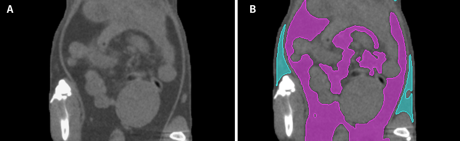 图二:(A)小鼠腹部Micro-CT二维矢状面;(B)将脂肪分割分离并分类,皮下脂肪显示为蓝色,内脏脂肪显示为紫色。