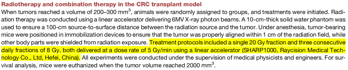 当肿瘤体积达到200-300mm³时,将动物随机分组并启动治疗。麻醉状态下,将荷瘤小鼠置于固定装置中,确保肿瘤与照射野精准对准,同时对身体其他部位进行辐射屏蔽。治疗方案包括单次20Gy分割照射和连续3天每日8Gy分割照射,两种方案均采用多模态图像引导的精准放疗系统(SHARP 1000,合肥锐视医疗科技有限公司)以5Gy/min的剂量率进行。生存分析中,当肿瘤体积达到2000mm³时,对小鼠实施安乐死处理。