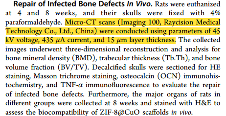 南方医科大学团队的研究成果《Intelligent Responsive Zeolitic Imidazolate Framework-8@Copper Oxide Nanocomposite 3D-Printed Scaffolds for Efficient Repair of Infected Bone Defects》发表于国际顶级学术期刊《ACS Nano》(IF=16.4006;JCR一区)。锐视超高分辨率·离活一体 Micro CT(IMAGING 100)在本研究中承担关键的影像学评估任务,为支架修复感染性骨缺损的效果提供了精准、可靠的数据支撑。
