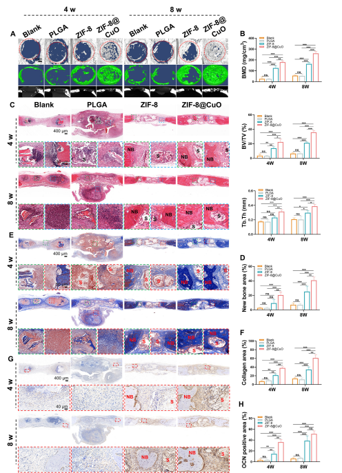 实验结果充分验证了ZIF-8@CuO/PLGA支架的优异性能和修复效果。材料表征显示,ZIF-8@CuO纳米颗粒成功制备,CuO纳米颗粒嵌入ZIF-8框架内,支架具有规则的多孔结构(大孔400-550μm,微孔5-30μm),孔隙率约68%,力学性能与骨组织匹配,且具有良好的降解特性。性能检测表明,支架在近红外照射下能快速升温,温度变化可通过质量分数和功率密度调控,且光热稳定性良好;在酸性环境中能加速释放Zn²⁺和Cu²⁺,同时具有显著的抗氧化活性,可有效清除H₂O₂和DPPH自由基。体外实验中,支架能显著促进PDSCs增殖、迁移和成骨分化,ALP活性及成骨相关基因(COL-1、Runx2、OPN)表达均显著升高;能促进 HUVECs 迁移和管形成,提升CD31表达;对金黄色葡萄球菌和大肠杆菌具有强效抗菌作用,ZIF-8@CuO+近红外组可实现细菌彻底清除。体内实验中,术后2周支架组感染得到有效控制,切口愈合良好,无脓肿形成,Micro CT显示骨缺损边缘光滑,无骨破坏;术后4周和8周,ZIF-8@CuO/PLGA组的BV/TV、BMD等参数显著高于其他组,新骨形成量充足,胶原蛋白沉积丰富,同时能促进血管生成,调控巨噬细胞从M1型向M2型极化,改善免疫微环境。