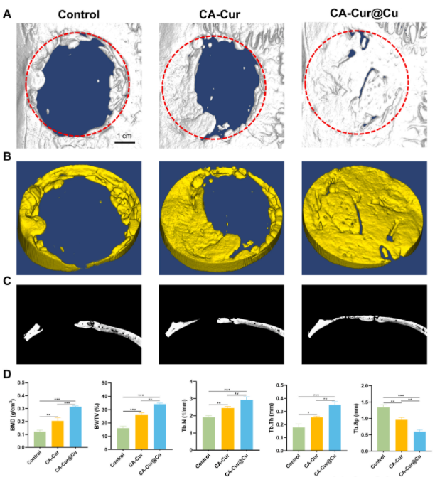 近日,南方医科大学团队在国际权威期刊《Materials Today Bio》(IF=10.704;JCR一区)发表题为《Copper-incorporated hydrogels loaded with curcumin microspheres for the repair of bone defects》的研究成果。该团队成功研发出一种集抗氧化、抗炎、促血管生成、成骨及抗菌功能于一体的新型复合水凝胶(CA-Cur@Cu hydrogel),为解决骨缺损修复中免疫紊乱、血管损伤和成骨障碍等多重难题提供了创新思路与潜在方案。锐视超高分辨率·离活一体 Micro CT(IMAGING 100)在本研究中承担关键的骨修复相关参数分析任务,为全面验证水凝胶的体内修复效能及生物安全性提供了精准、可靠的数据支撑。