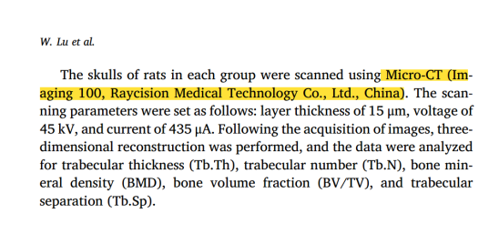 南方医科大学团队在国际权威期刊《Materials Today Bio》(IF=10.704;JCR一区)发表题为《Copper-incorporated hydrogels loaded with curcumin microspheres for the repair of bone defects》的研究成果。该团队成功研发出一种集抗氧化、抗炎、促血管生成、成骨及抗菌功能于一体的新型复合水凝胶(CA-Cur@Cu hydrogel),为解决骨缺损修复中免疫紊乱、血管损伤和成骨障碍等多重难题提供了创新思路与潜在方案。锐视超高分辨率·离活一体 Micro CT(IMAGING 100)在本研究中承担关键的骨修复相关参数分析任务,为全面验证水凝胶的体内修复效能及生物安全性提供了精准、可靠的数据支撑。