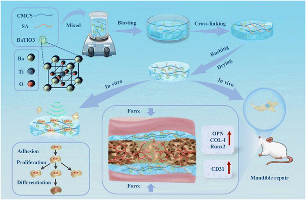 CSSA–BTO压电复合膜骨再生技术流程与作用机制示意图