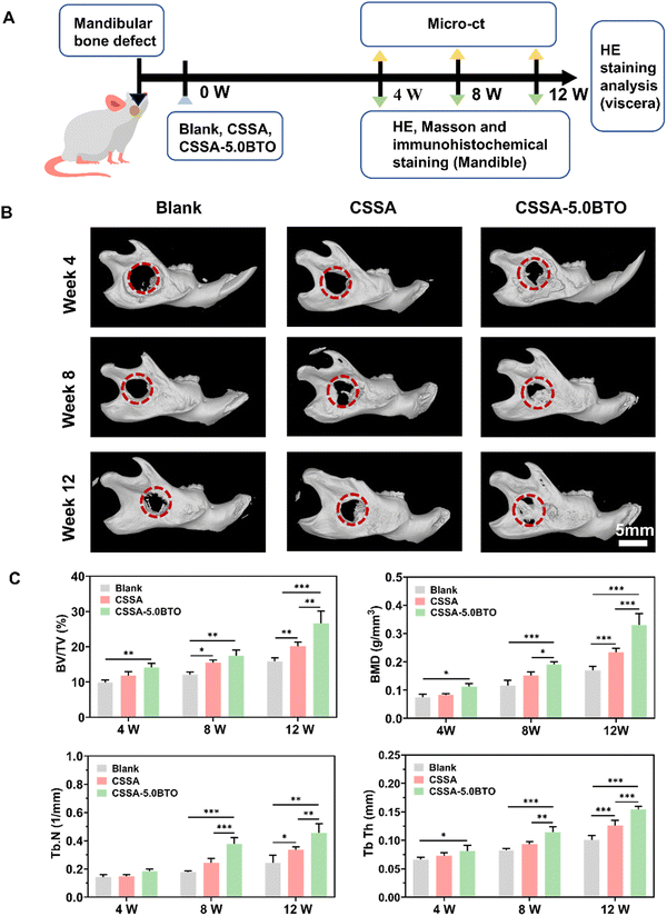 选用成年雄性大鼠建立下颌骨缺损模型,分为三组:CSSA组、CSSA-5.0BTO组和空白对照组。
